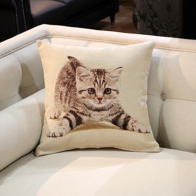 ポルトガル製の華やかなジャガード織クッションカバー。 ふんわり優しい表情の猫たちが描かれた、心なごむデザイン。 ソファ・ベッド・一人掛けチェアなど、どんな場所にも合わせやすい落ち着いたカラーで、インテリアのアクセントにもぴったりです。 しっかりとしたジャガード織り素材なので、プリントでは出せない立体感と高級感を演出。 季節を問わず一年中使えるファブリッククッションカバーです。 ポルトガルジャガード クッションカバー チェルシー 45×45 商品説明 サイズ/(約)45cm×45cm 材質/綿40%、ポリエステル36%、アクリル24% 備考 ・ファスナー式(中材は付属しておりません) ・裏面も同様のデザインとなりますが柄の位置は一点ごとに異なります。 洗濯方法 ・40℃以下の弱水流で洗濯可 ・漂白剤使用不可 ・タンブル乾燥不可。日陰でのつり干しを推奨します。 ・中温アイロン可(150℃まで) ・ドライクリーニング・ウェットクリーニング可 生産国/ポルトガル 配送方法/追跡可能メール便 ※郵便受け・メール室等に投函となります。日時指定はできません。 ※発送からお荷物到着に1~3日程度の日数が必要となります。 注意事項 ※海外製品の為、素材の不均一感やラフ感、色ムラ、小さなほつれなどみられる場合がございます。予めご了承の上、お買い求めください。 ※商品の色につきましては、ブラウザのカラー設定やお部屋の照明、ライト種類などにより実物とは微妙に色が異なる場合がございます。何卒ご理解の程お願い申し上げます。