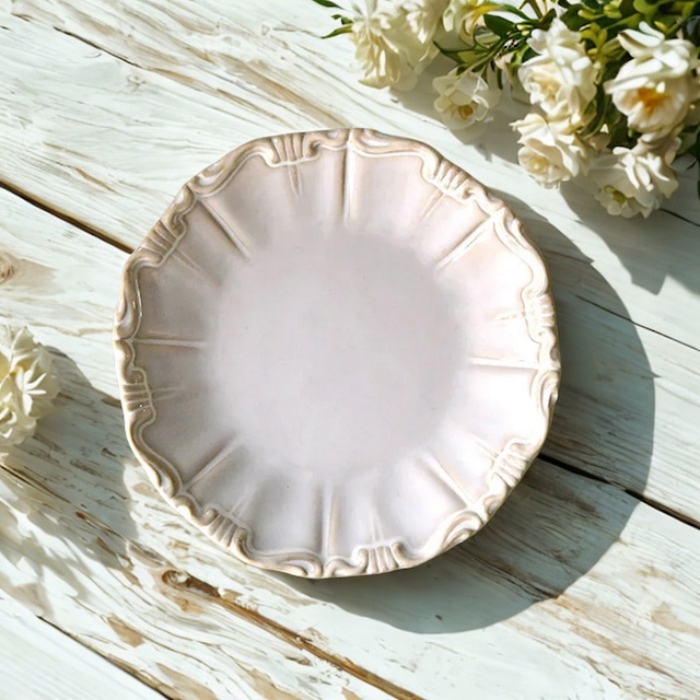食卓をエレガントに彩るアンティーク調のラウンドプレート。 柔らかなシャビーホワイトに、縁取りに施されたベージュのレリーフ装飾がアクセントとなり、まるでヨーロッパ食器のようなクラシカルな雰囲気を演出します。 朝食やスイーツ、ティータイムはもちろん、おもてなしのテーブルにもぴったり。置くだけで写真映えするので、カフェ風のテーブルコーディネートにもおすすめの一枚です。 ノブレス ラウンドプレート Mサイズ サイズ /(約)直径20cm 平面部直径:(約)10.5cm 材質 /陶器 備考/食洗機・電子レンジ・オーブン可 生産国/中国 配送方法 /宅配便(小型配送60サイズ) ※沖縄、離島、一部地域は別途送料が必要となります。 注意事項 ※ハンドメイド製品の為、色の濃淡、柄の出方などに若干の個体差がございます。 ※陶器の性質上、素材の不均一感やラフ感、色ムラ、小さな穴、黒点などみられる場合がございますが不良ではございません。 明らかな破損以外での返品・交換等はお受けできかねますので、予めご了承の上、お買い求めください。 ※商品の色につきましては、ブラウザのカラー設定やお部屋の照明、ライト種類などにより実物とは微妙に色が異なる場合がございます。何卒ご理解の程お願い申し上げます。