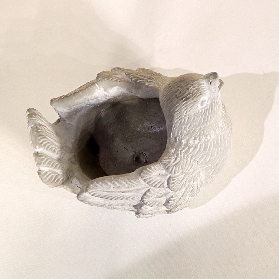愛らしい小鳥のフォルムが目を引く、セメント素材のプランター。