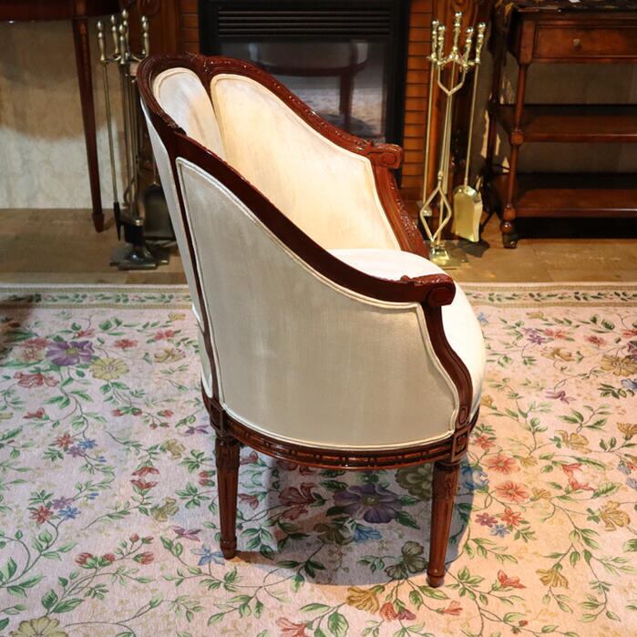 上質なマホガニー材と肌触りの良いアイボリーのファブリック生地を使用した一人掛けソファ。暖かみのある天然木の風合いと、細部にまで施された職人による繊細な彫りが特徴です。