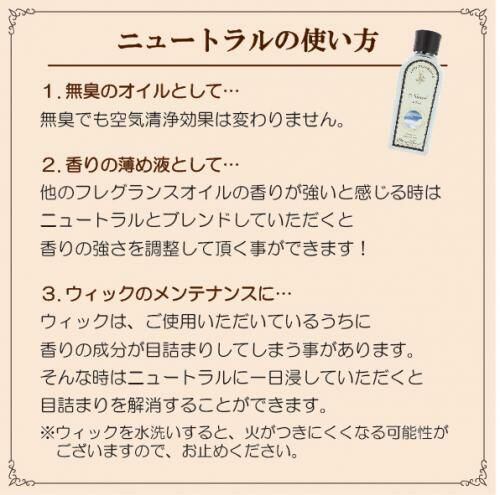 ニュートラルオイルを使用して、定期的に管理していただければ、抗菌効果やフレグランスの香りの持続効果を高めることができますので、より長くご使用することができます。