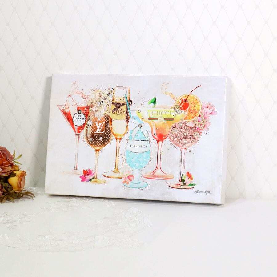華やかなカクテルグラスの中に、ラグジュアリーブランドのロゴが描かれた、遊び心あふれる一枚です。