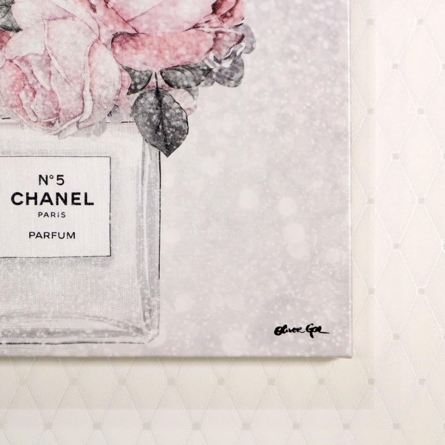 香水ボトルに咲き誇るピンクローズを描いた、華やかでエレガントな一枚です。