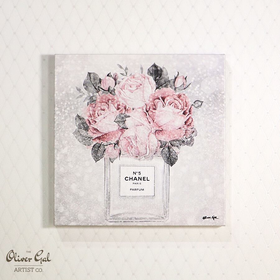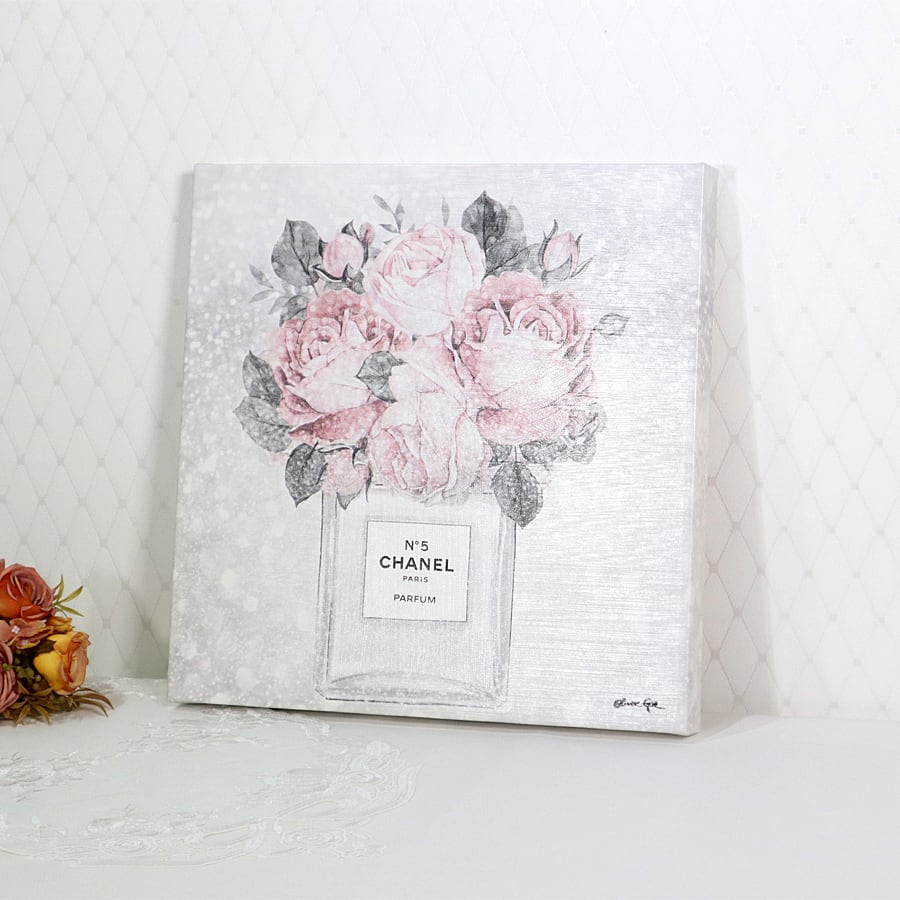 香水ボトルに咲き誇るピンクローズを描いた、華やかでエレガントな一枚です。