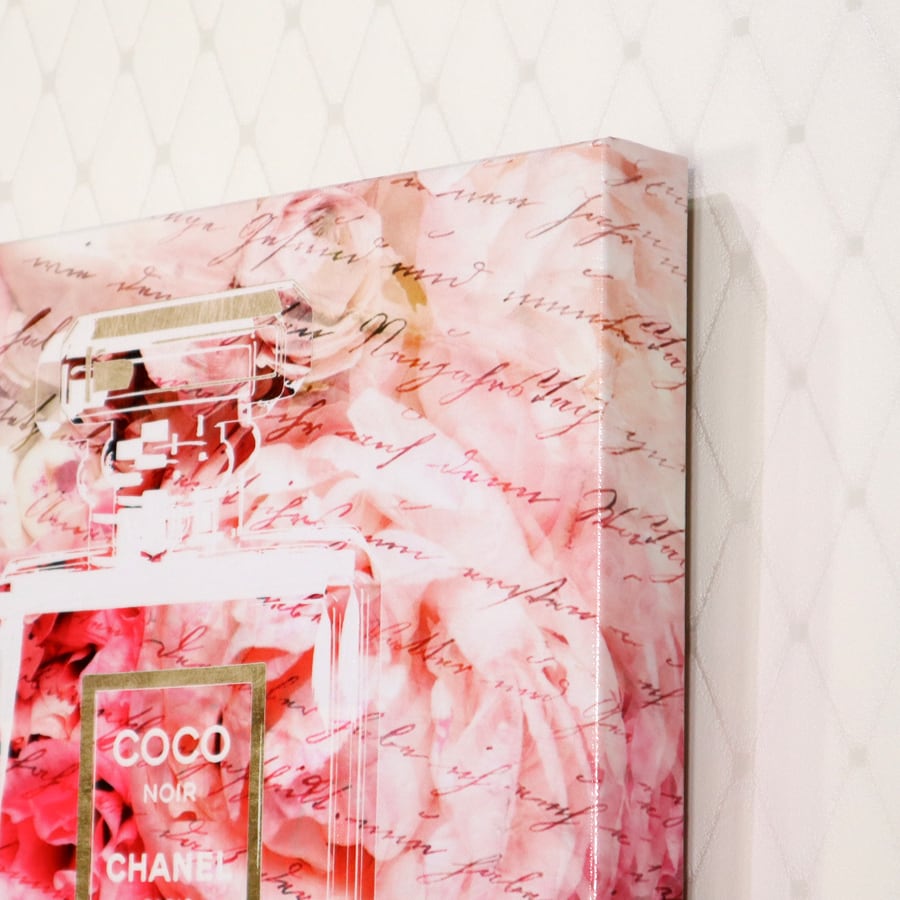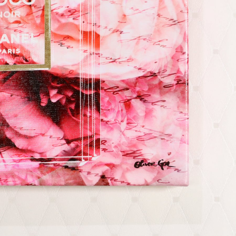 華やかなピンクフラワーを背景に、香水ボトルをモチーフにしたモダンアートです。