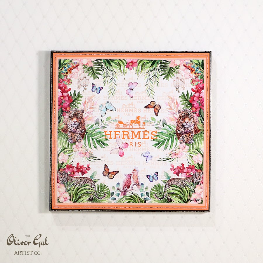 ラグジュアリーなデザインに、トロピカルフラワー、蝶、ジャガーなどを組み合わせた華やかなキャンバスアートです。