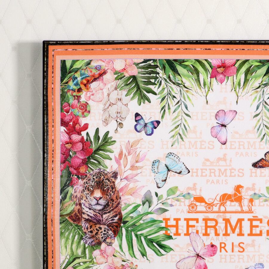 ラグジュアリーなデザインに、トロピカルフラワー、蝶、ジャガーなどを組み合わせた華やかなキャンバスアートです。