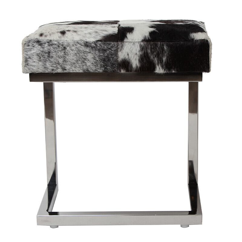 上質な天然毛皮と艶やかなメタルフレームが融合した、モダンでラグジュアリーなスツール。
