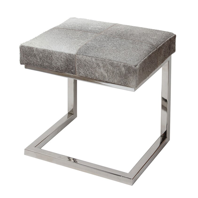 上質な天然毛皮と艶やかなメタルフレームが融合した、モダンでラグジュアリーなスツール。