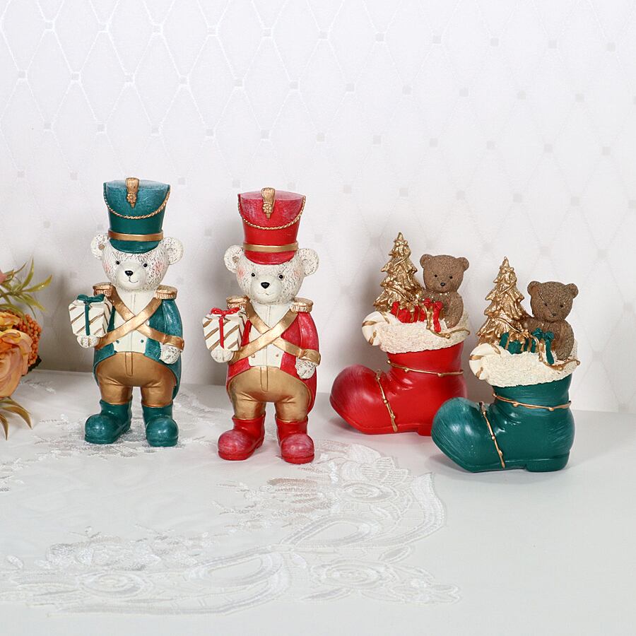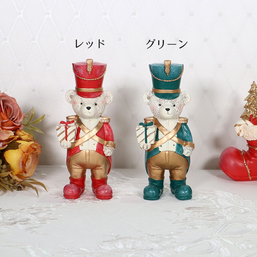 赤とグリーンのクラシックなカラーリングに、ゴールドの差し色が映える上品なデザイン。手にはそれぞれギフトボックスを抱えており、クリスマスらしい華やかさを演出します。