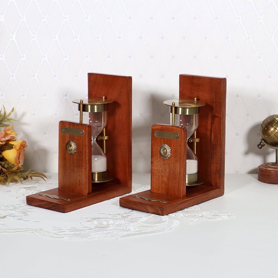 クラシカルな木製フレームに真鍮の砂時計を組み合わせた上品なブックエンド。