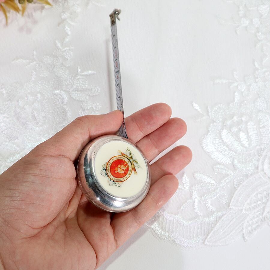 パリの香りを感じるレトロなラベルデザインが施された、手のひらサイズの巻き尺です。