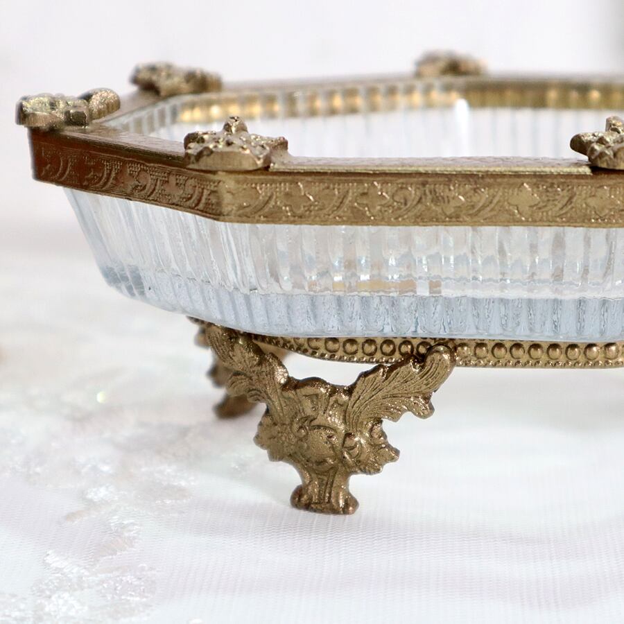 繊細なカットガラスと真鍮フレームを組み合わせたアンティーク調のトレイ。