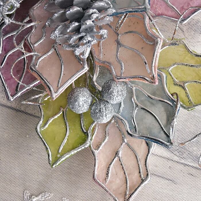 淡いパステルカラーの葉には、天然のカピス貝を贅沢に使用。光を受けて優しく透けるように輝き、上品で洗練された雰囲気を演出します。