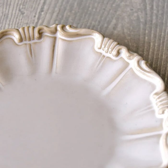 柔らかなシャビーホワイトに、縁取りに施されたベージュのレリーフ装飾がアクセントとなり、まるでヨーロッパ食器のようなクラシカルな雰囲気を演出します。
