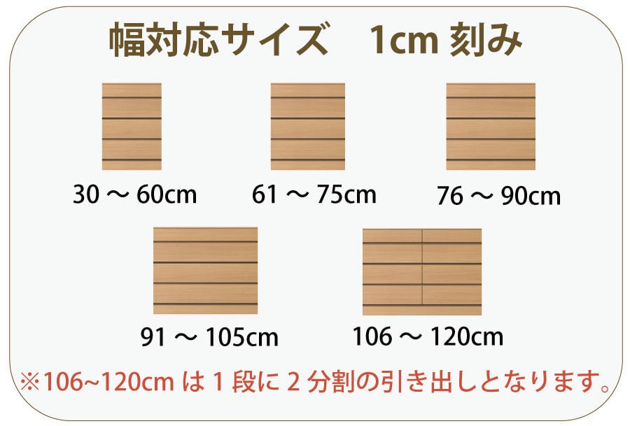 ※幅は1cm変われば引き出し内寸の幅も1cm変わります。