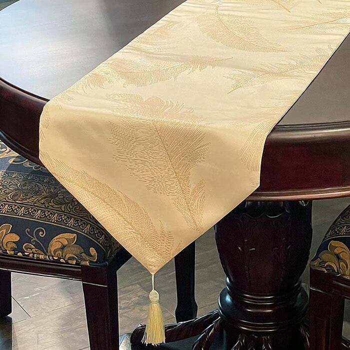 上品なフェザー柄が印象的なタッセル付きテーブルランナー。