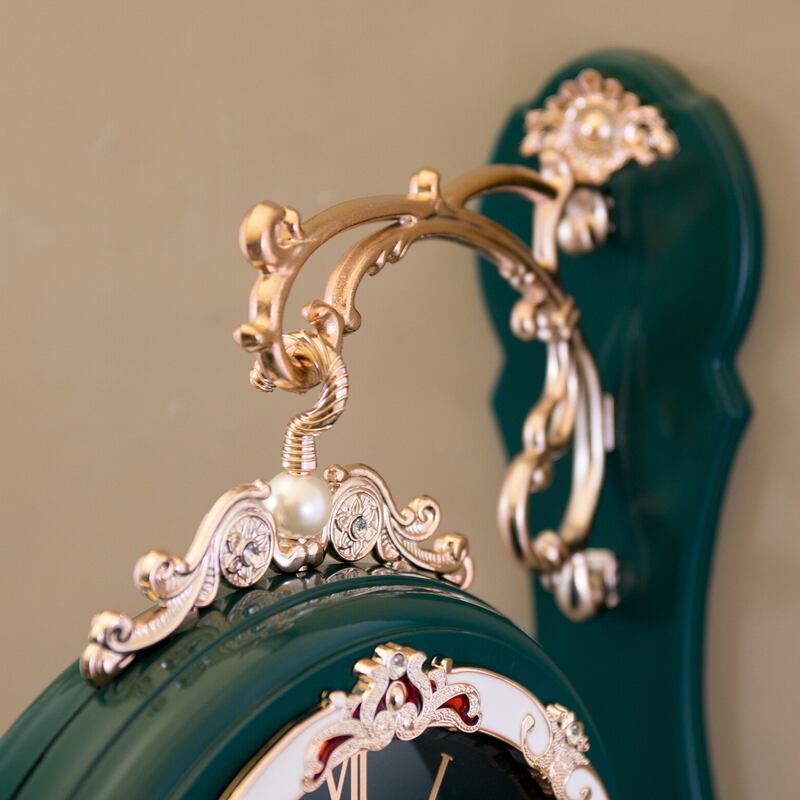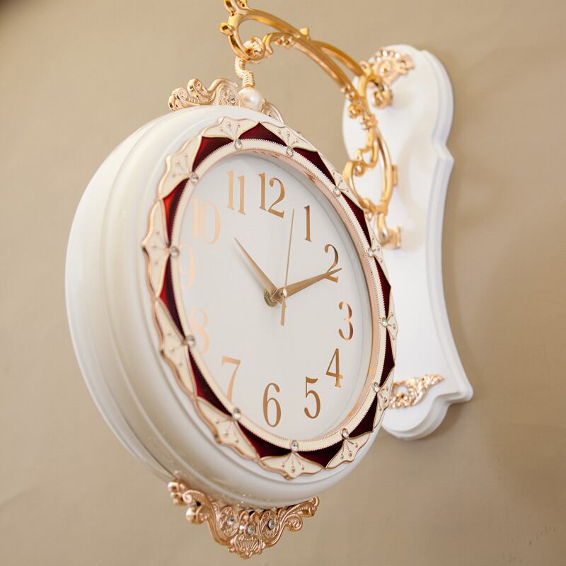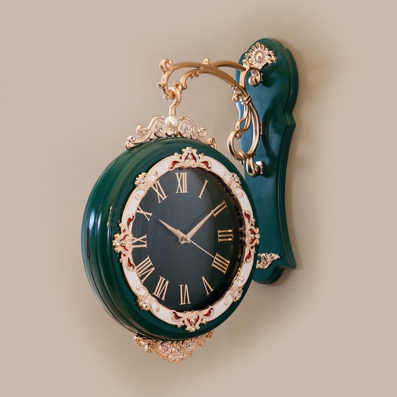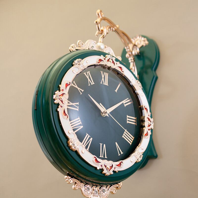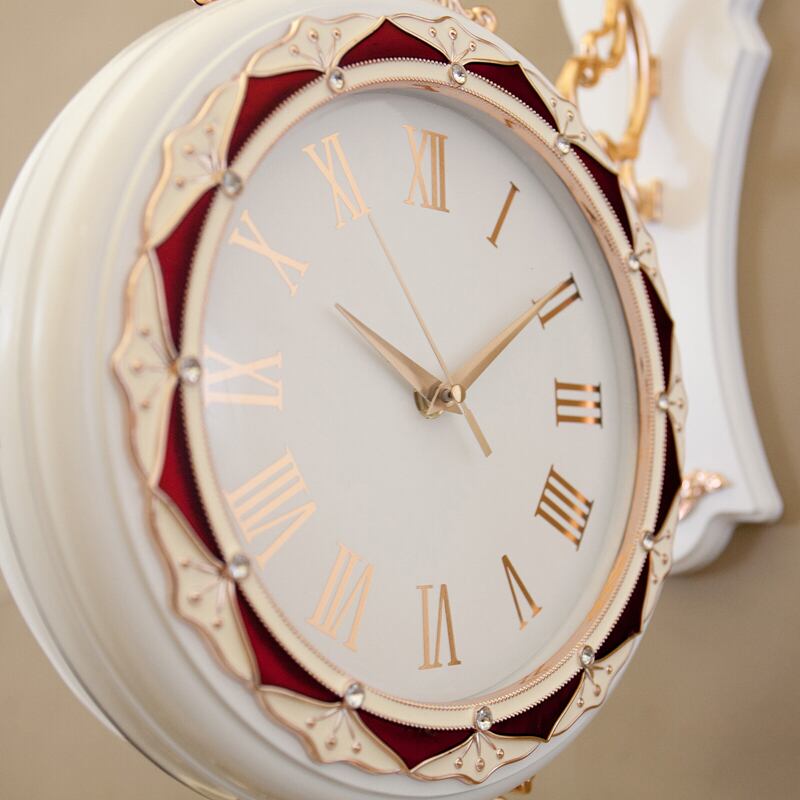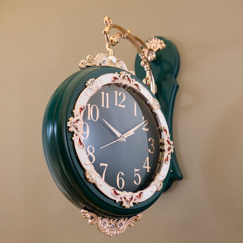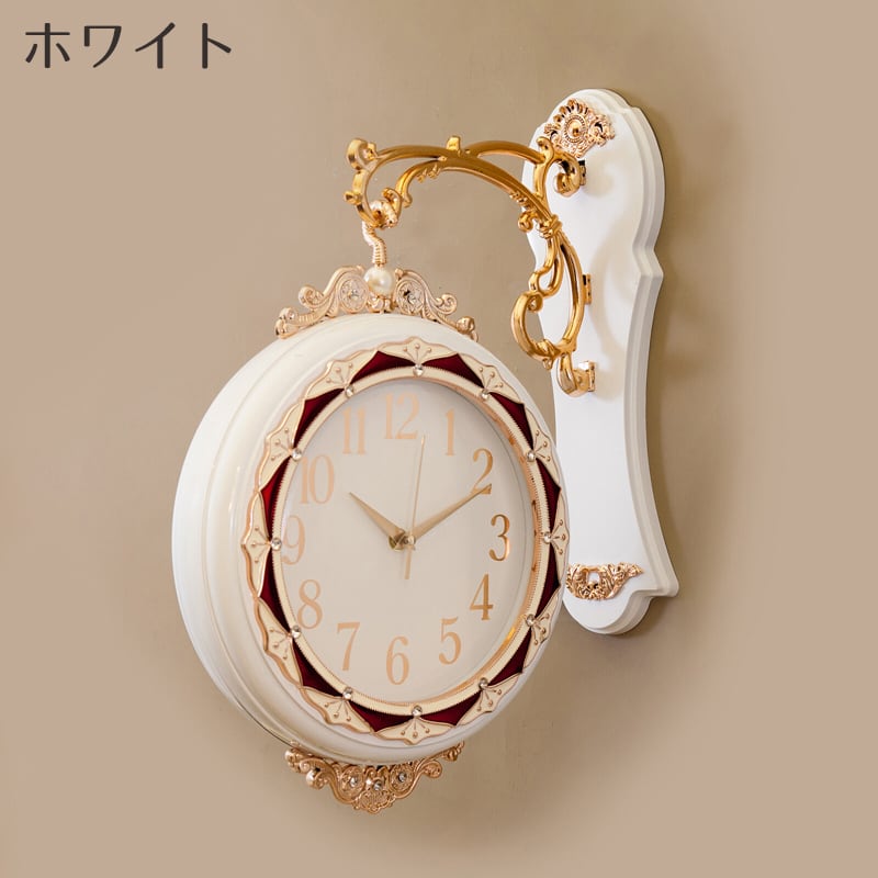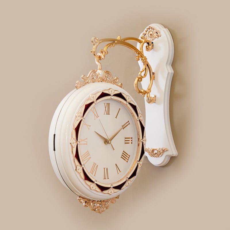 クラシカルな装飾美が目を引く、両面タイプのウォールクロック。