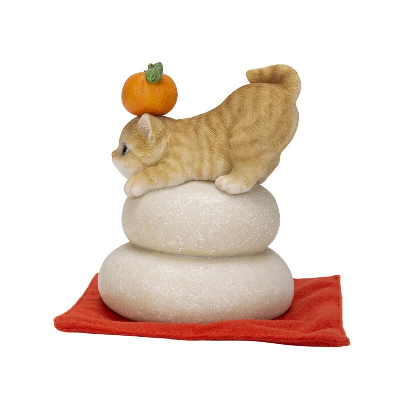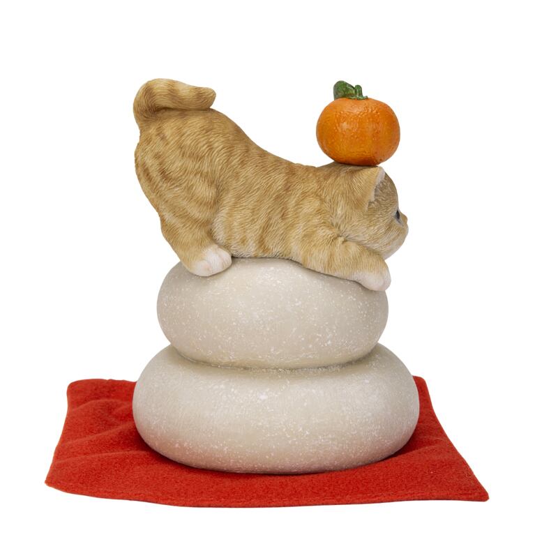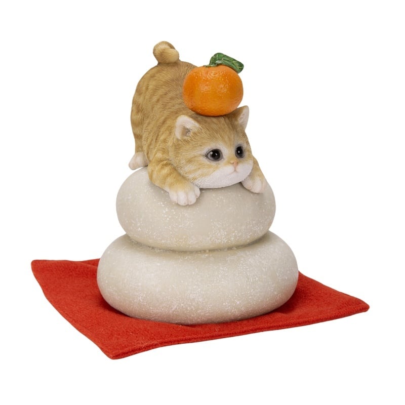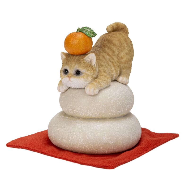 みかんを頭に乗せた愛らしいネコちゃんの鏡餅オブジェ。
