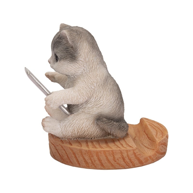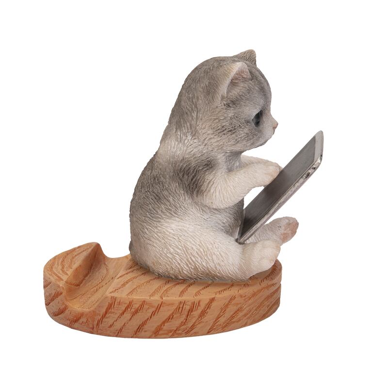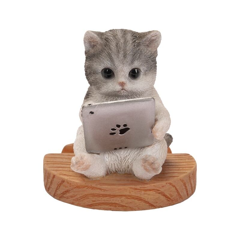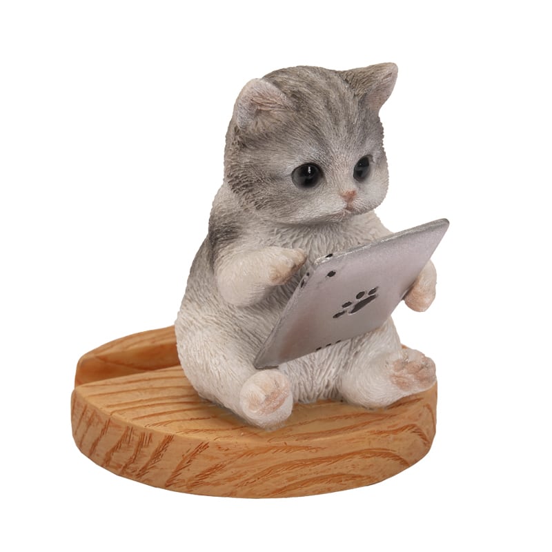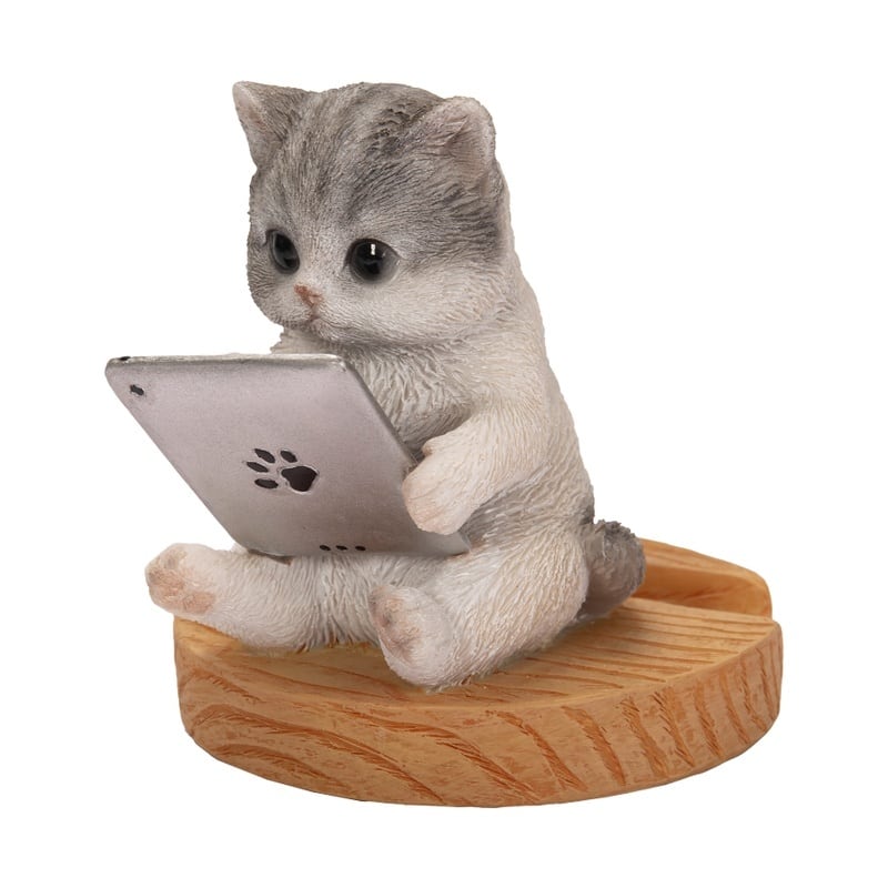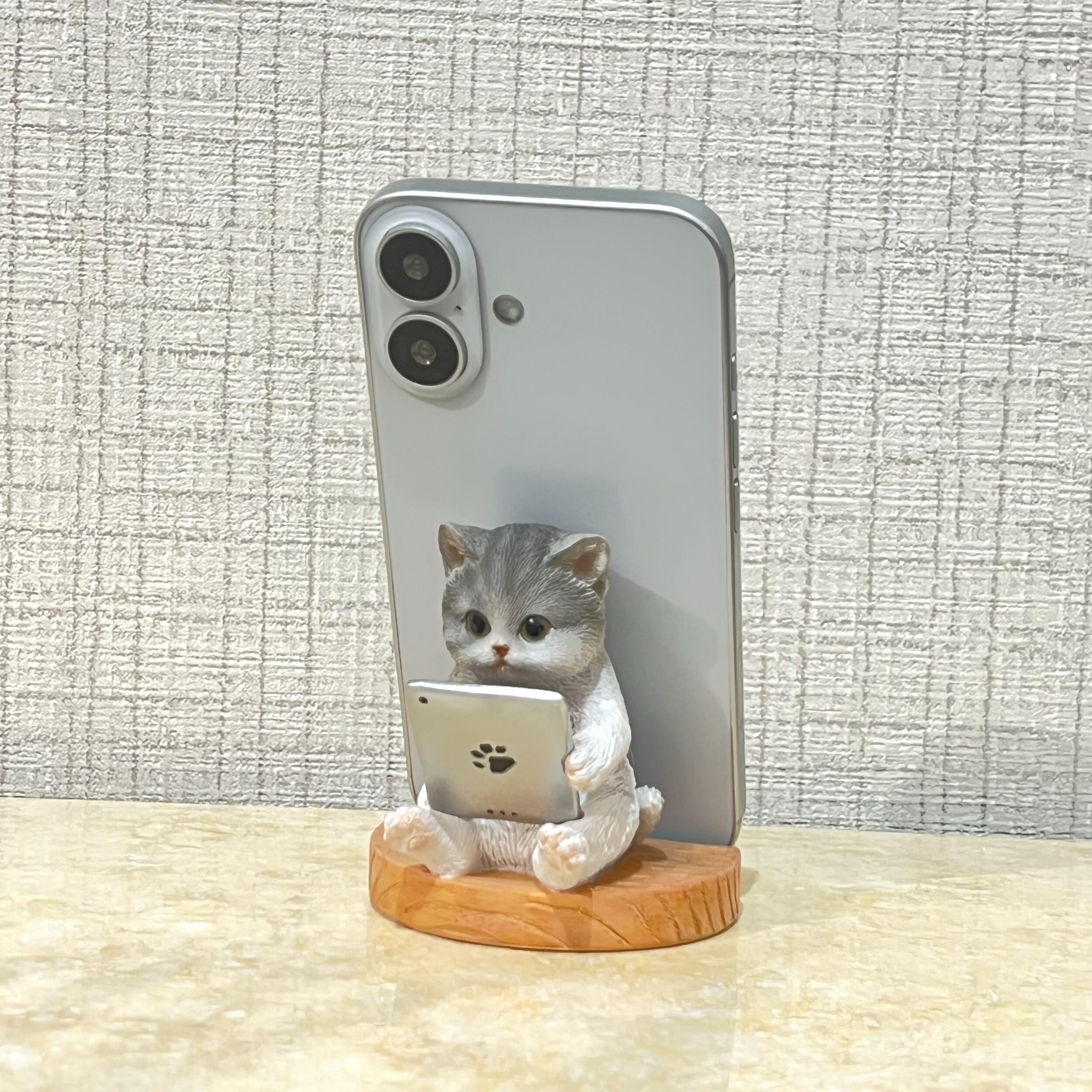 ちょこんと座ってタブレットを見つめる、ねこモチーフのスマホスタンド。