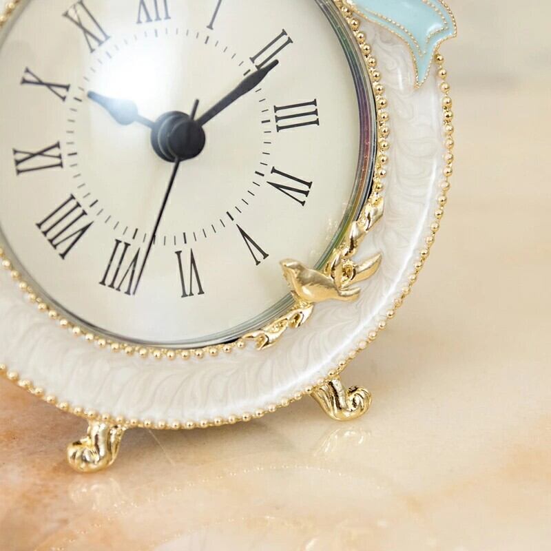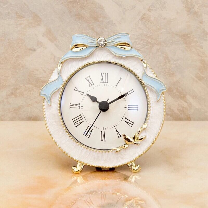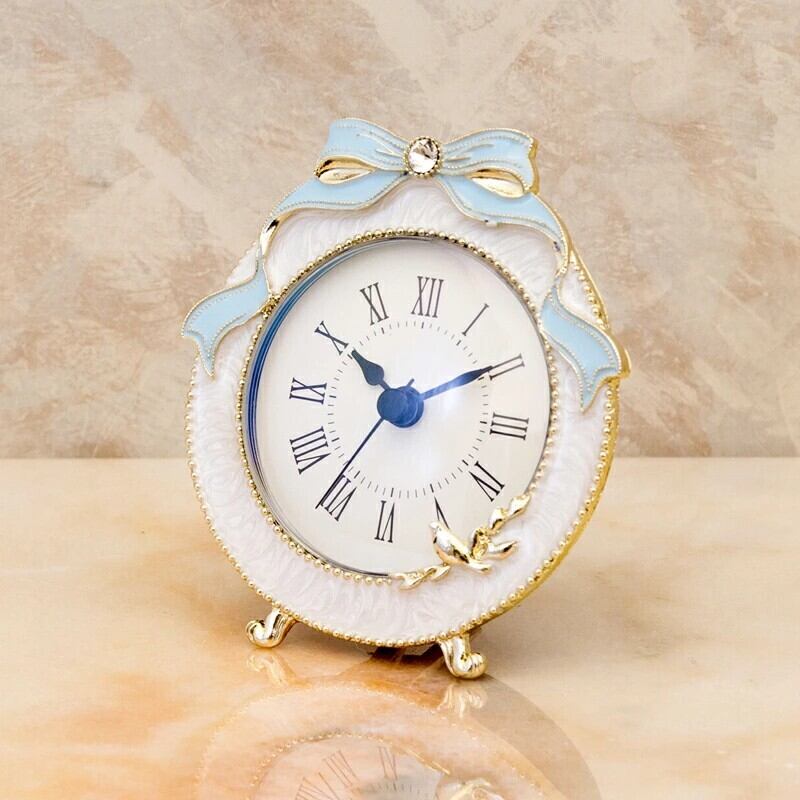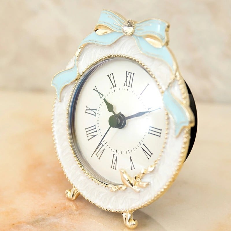 ブルーリボンと繊細な装飾が目を惹く、エレガントな置き時計。