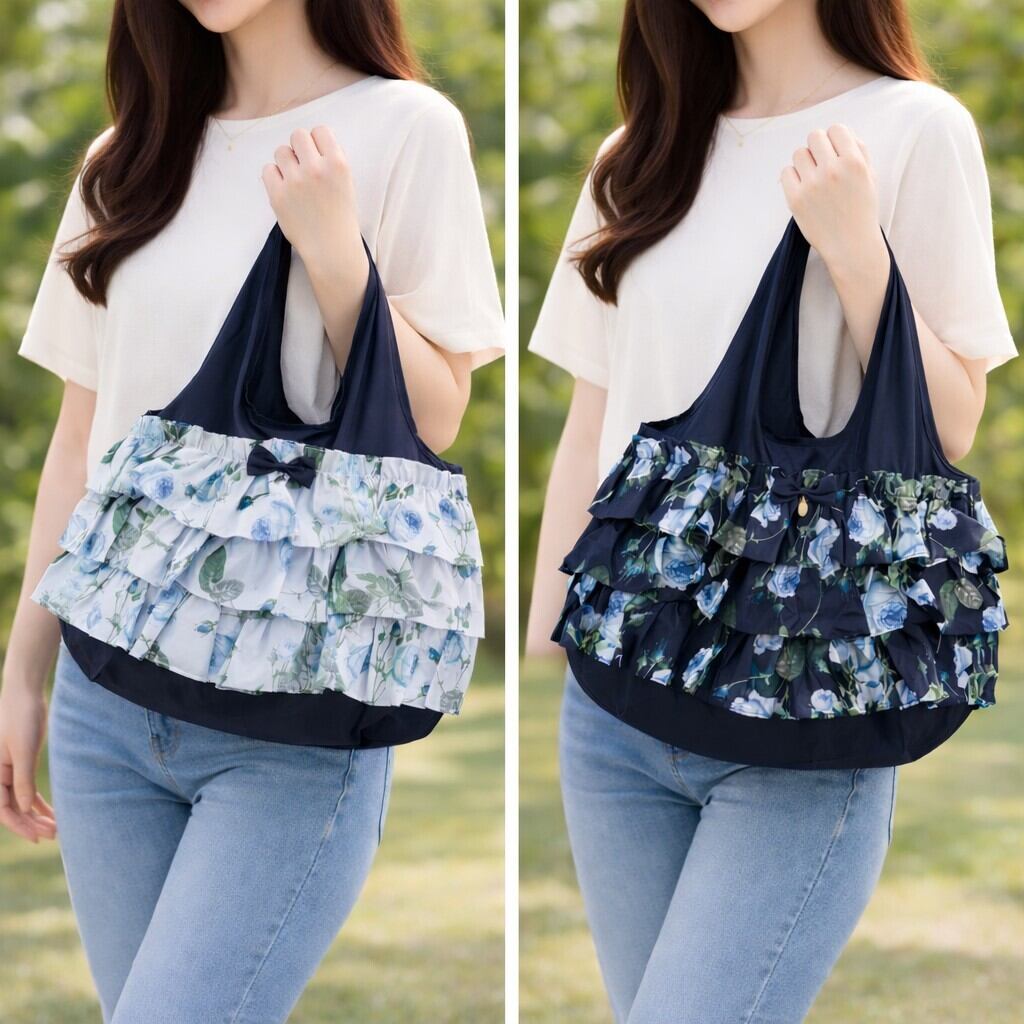 贅沢な3段フリルで持つだけで華やぐ他にはない立体デザインで大人のための上品エコバックです。