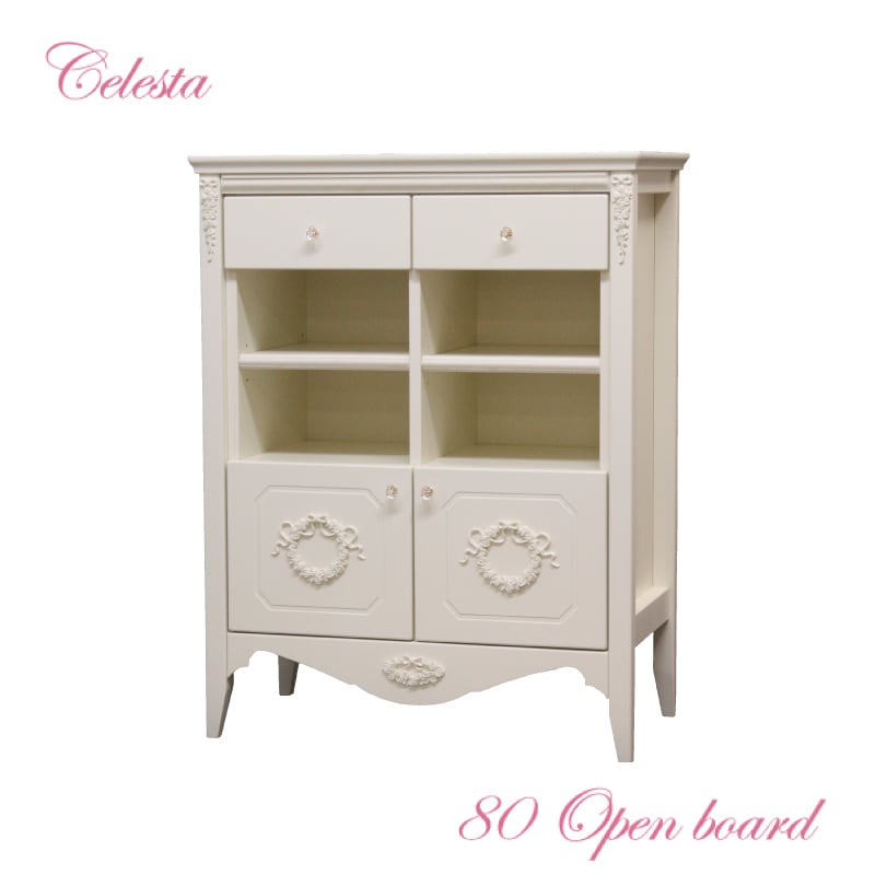 オリジナルのローズ&リボンのレリーフがかわいいリエルショップ限定の白家具【チェレスタ】シリーズ。上品で落ち着きのあるカラーと高貴なシルエットが人気のオープンボードです。
