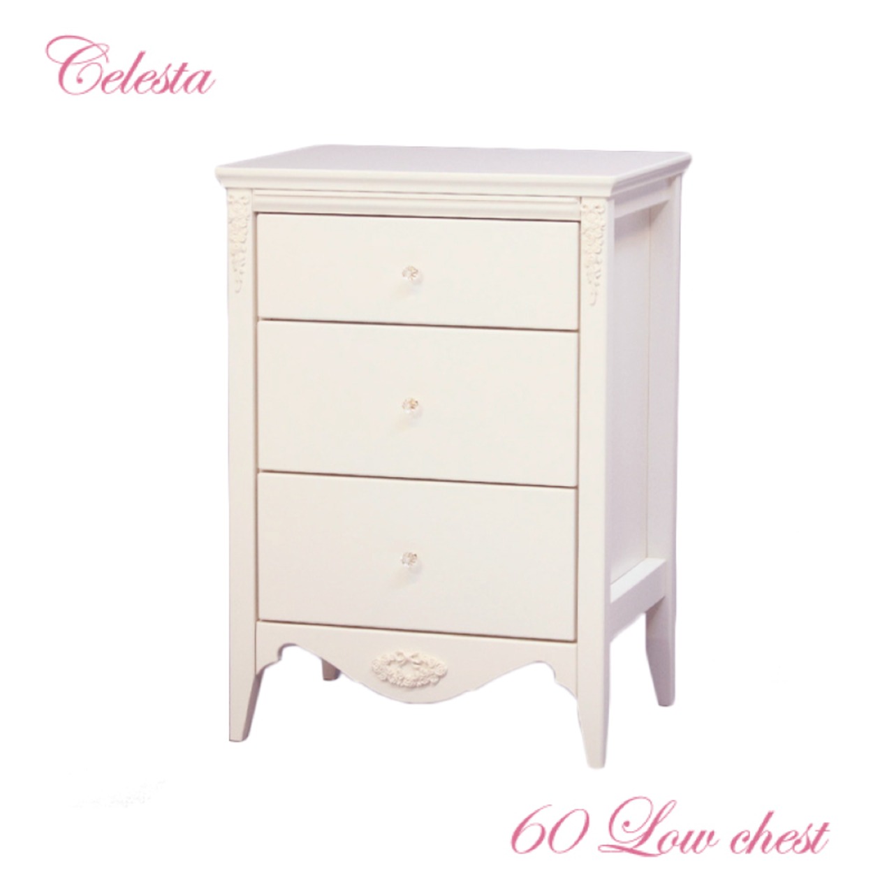 チェレスタ 60ローチェスト開梱設置配送 つまみ・奥行き選択可 完成品 白 3段 ローズ エレガント 収納 チェスト シンプル 引き出し ホワイト 姫 子供部屋 おしゃれ かわいい 白家具 脚付き 電話台 木製 国産