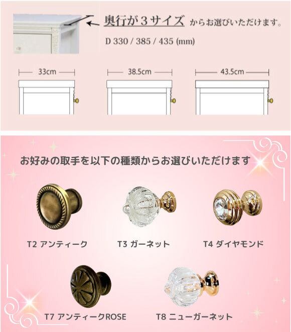 さらに奥行きを3サイズ(43.5cm・38.5cm・33cm)、つまみを5種類から選択可能。お部屋の広さやお好みに合わせてお選びいただけます。