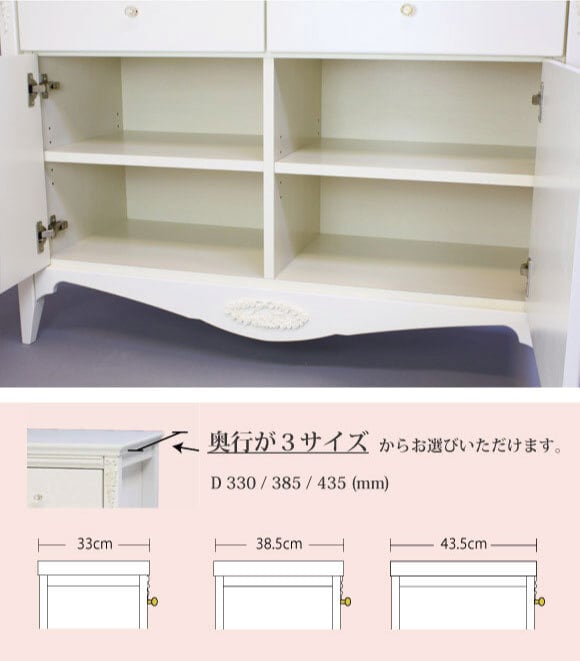 チェレスタ 120ローボード開梱設置配送 つまみ・奥行き選択可 オリジナルデザイン 扉 ホワイト 木製 国産 キャビネット ローズ エレガント シンプル ガーリー プリンセス 姫系 かわいい おしゃれ 白家具 チェスト 引き出し 収納 完成品