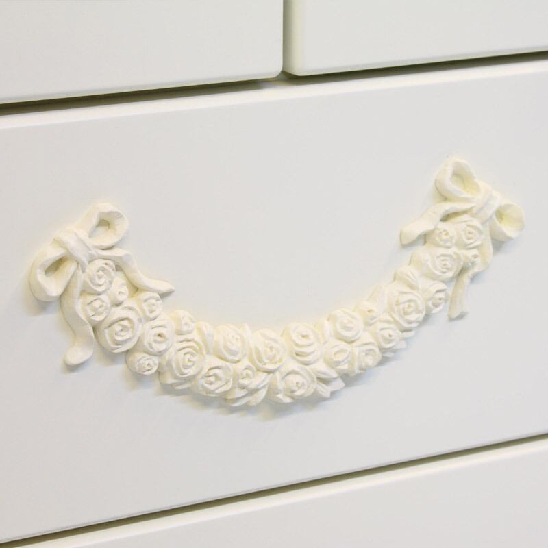 オリジナルのローズ&リボンのレリーフがかわいいリエルショップ限定の白家具【チェレスタ】シリーズ。上品で落ち着きのあるカラーと高貴なシルエットが人気です。