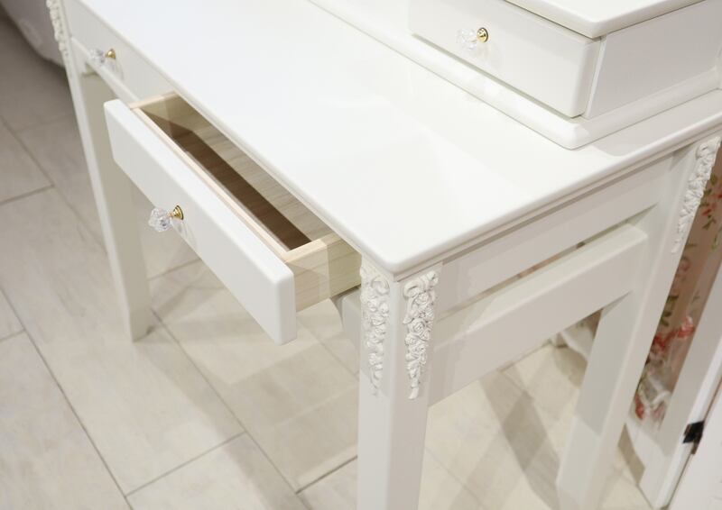 オリジナルデザインのローズ飾りと、優しく包み込まれるような上品なホワイトカラーが特徴の白家具【チェレスタ】シリーズ。