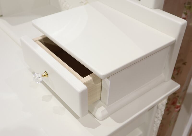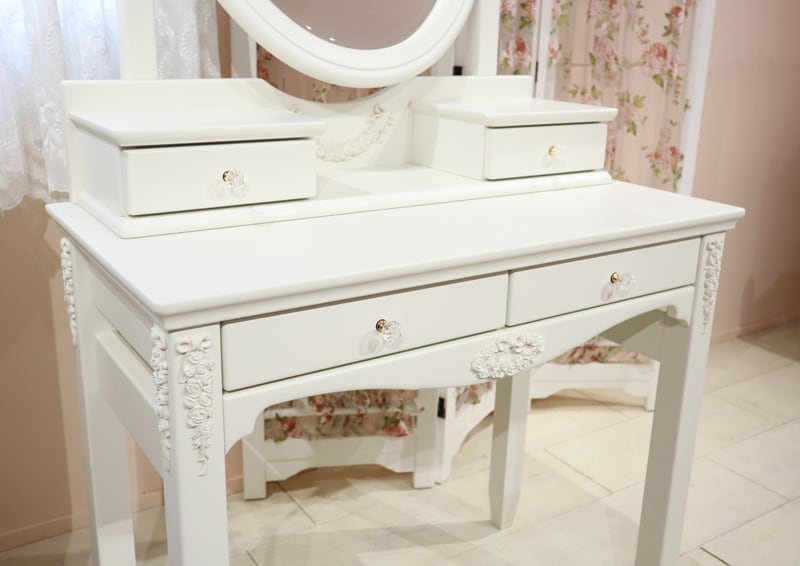 オリジナルデザインのローズ飾りと、優しく包み込まれるような上品なホワイトカラーが特徴の白家具【チェレスタ】シリーズ。