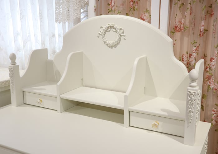 オリジナルのローズ&リボンのレリーフがかわいいリエルショップ限定の白家具【チェレスタ】シリーズ。