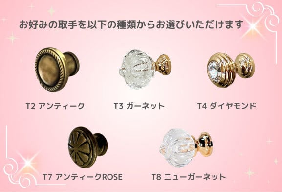 さらに奥行きを3サイズ(43.5cm・38.5cm・33cm)、つまみを5種類から選択可能。お部屋の広さやお好みに合わせてお選びいただけます。