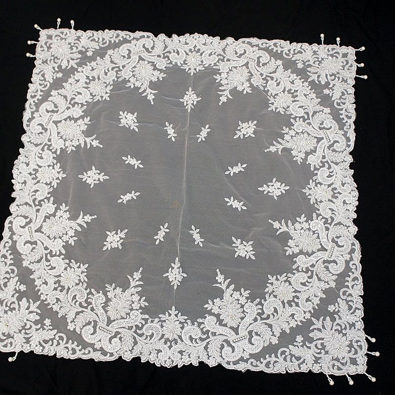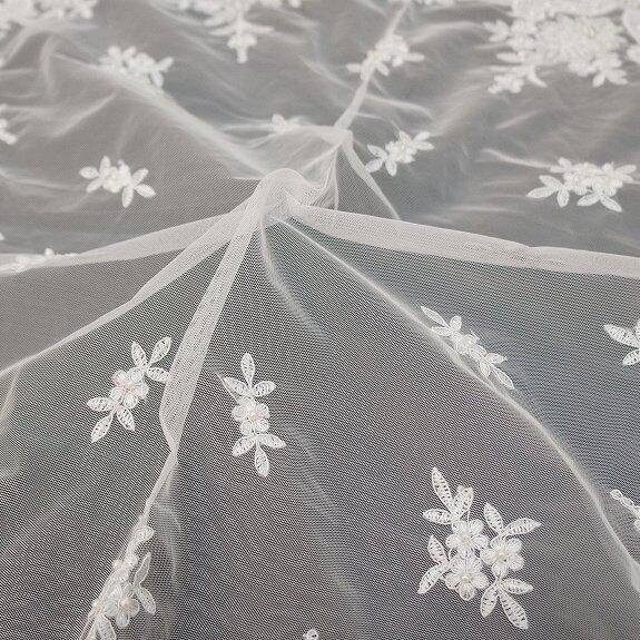 高級感のあるホワイト系の生地に、ハンドメイドでビーズ・スパンコール・フェイクダイヤが施されています。