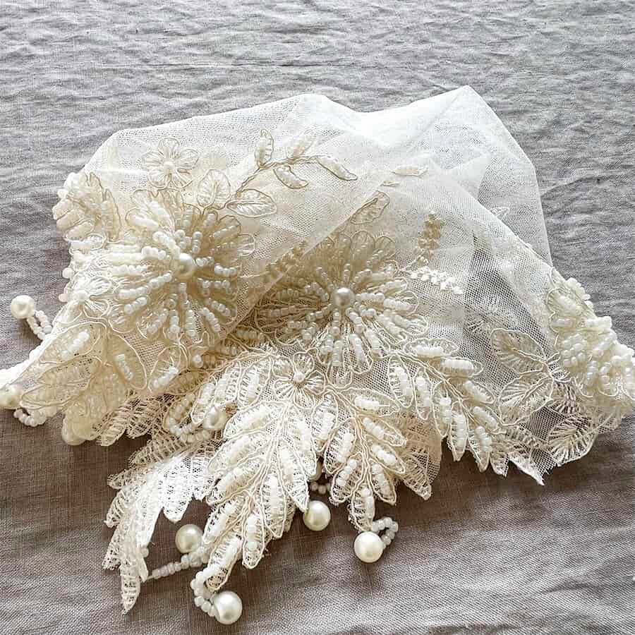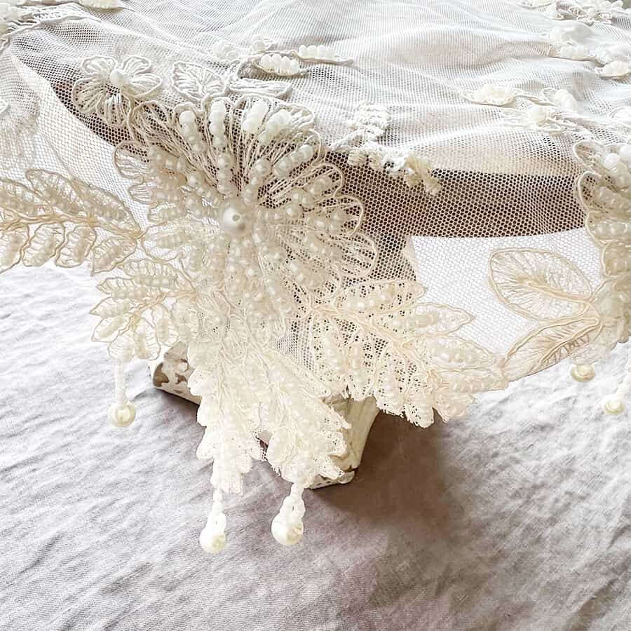 高級感のあるベージュ系の生地に、ハンドメイドでビーズが施されています。