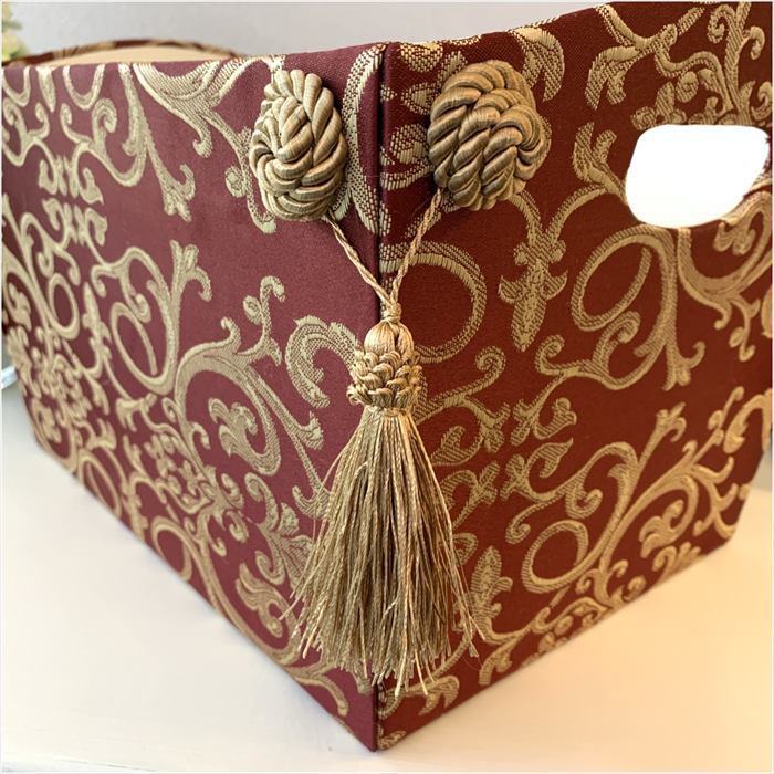 深い赤系の布地にアラベスク模様が施されており、クラシックで落ち着いた仕上がり。4隅のタッセルも印象的です。