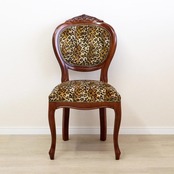 ヒョウ柄のお洒落なデザインの生地に、伝統のカービングフレームと猫脚が特徴です。