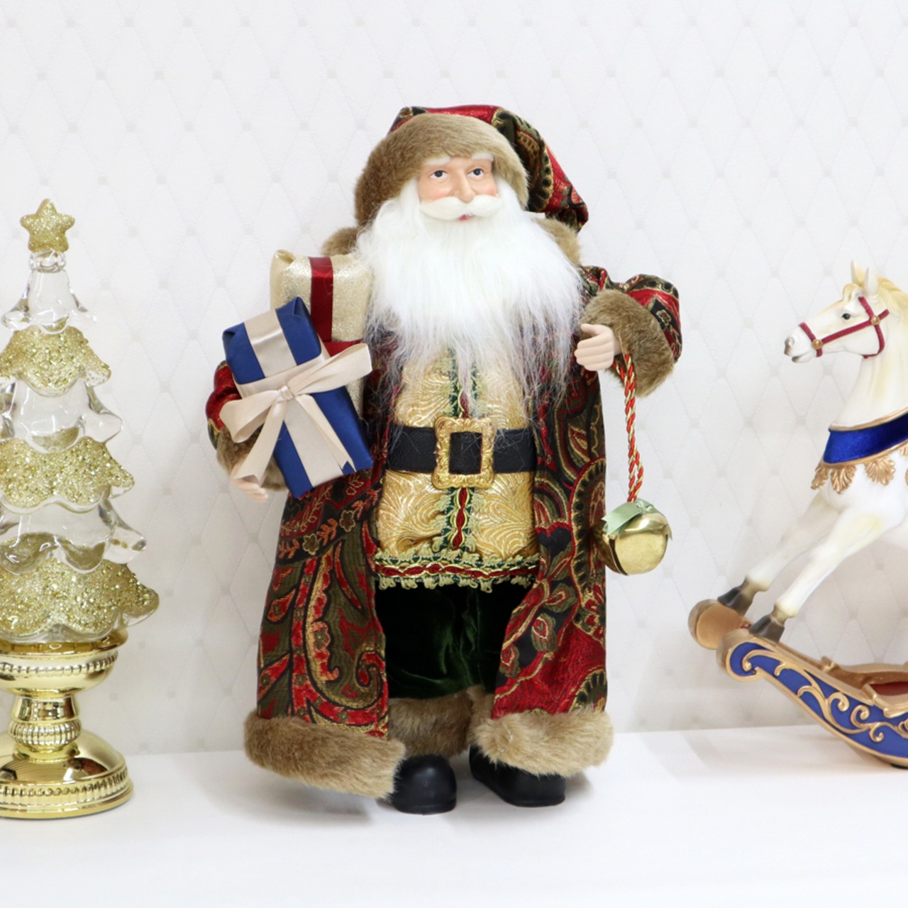 シックな赤色のガウンにゴールドのベストを着たお洒落なサンタクロース人形。