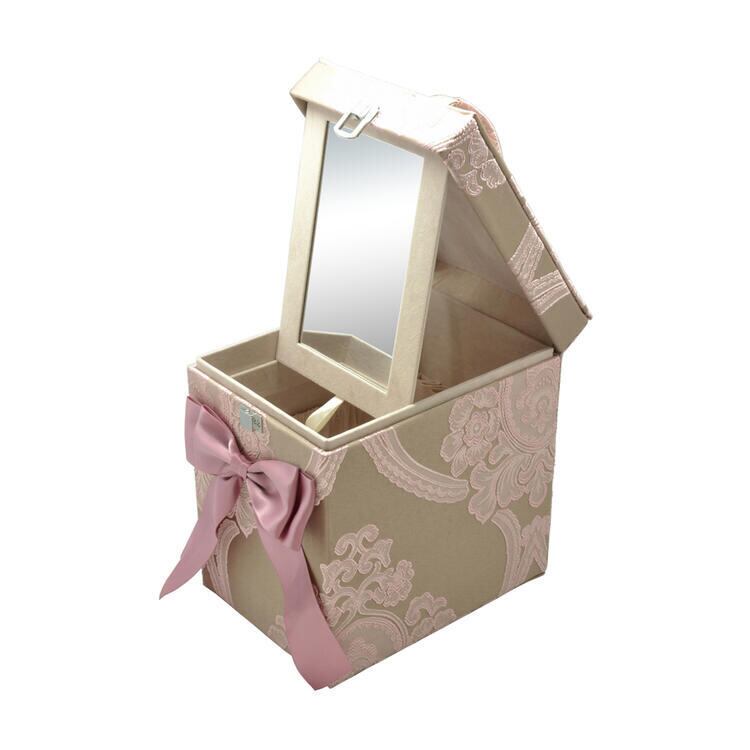 蓋を開けるとミラー付きで、内側にはメイクブラシなどを収納できるポケットが付いています。