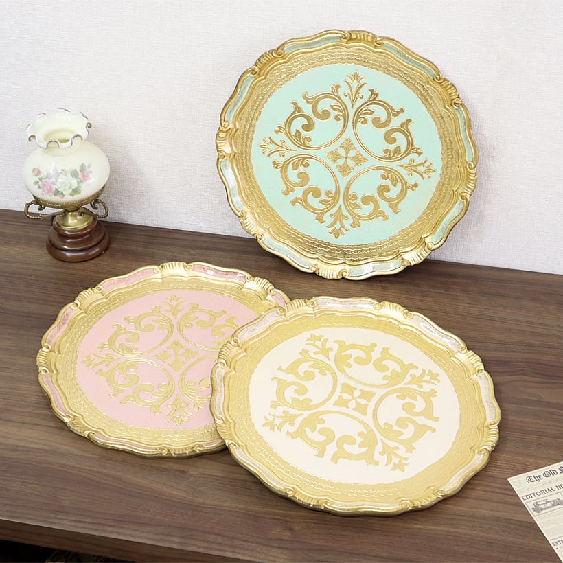 トレイ本体にはお洒落なアラベスク模様が型押しされ、手彩色でアンティーク調に仕上げられています。