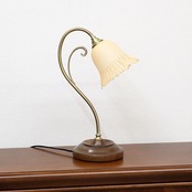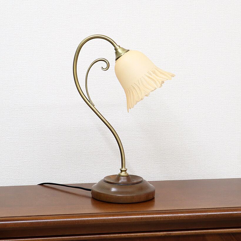 お洒落なデザインのガラスシェードや真鍮フレーム、木製ベースの組み合わせが美しい仕上がりを実現しています。